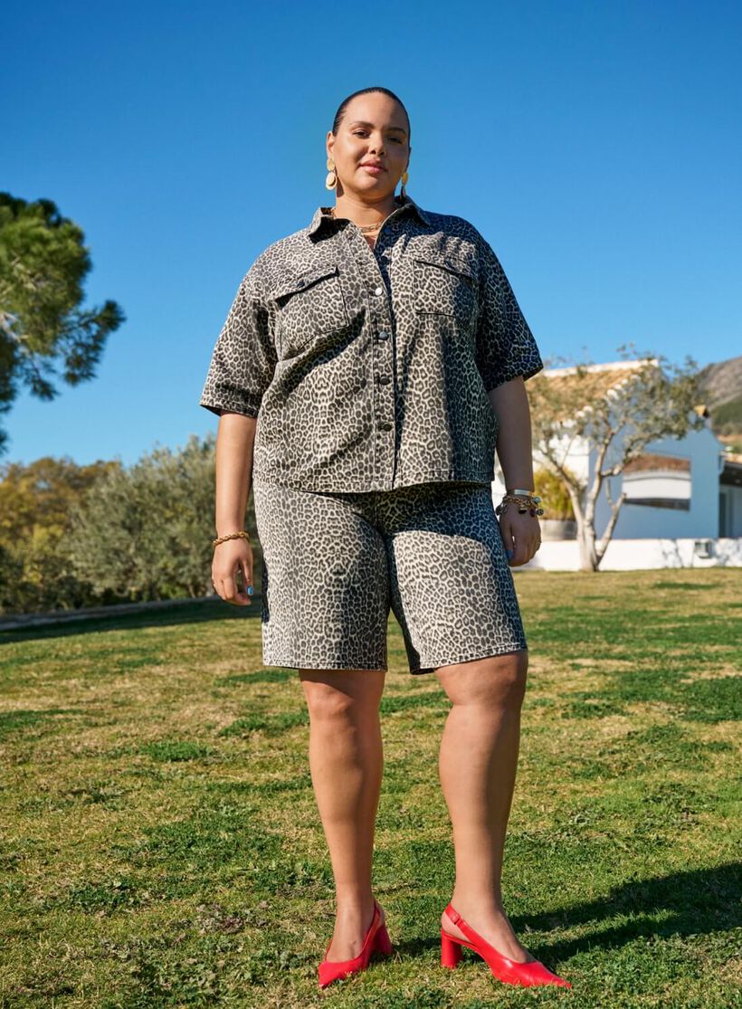 Chemise en denim 100 % coton avec une coupe ample et une fermeture à boutons. Le t-shirt a un imprimé léopard tendance, des poches poitrine, un col classique et des manches courtes et larges.