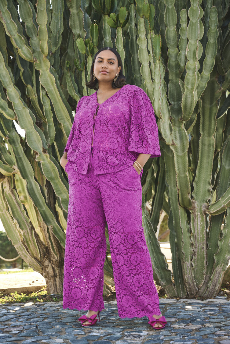 Chemisier en dentelle féminin avec de beaux détails floraux dans un design léger et élégant sans doublure. Le chemisier a une coupe régulière, des manches trois-quarts amples et s'ouvre devant avec trois nœuds délicats comme fermetures décoratives.
