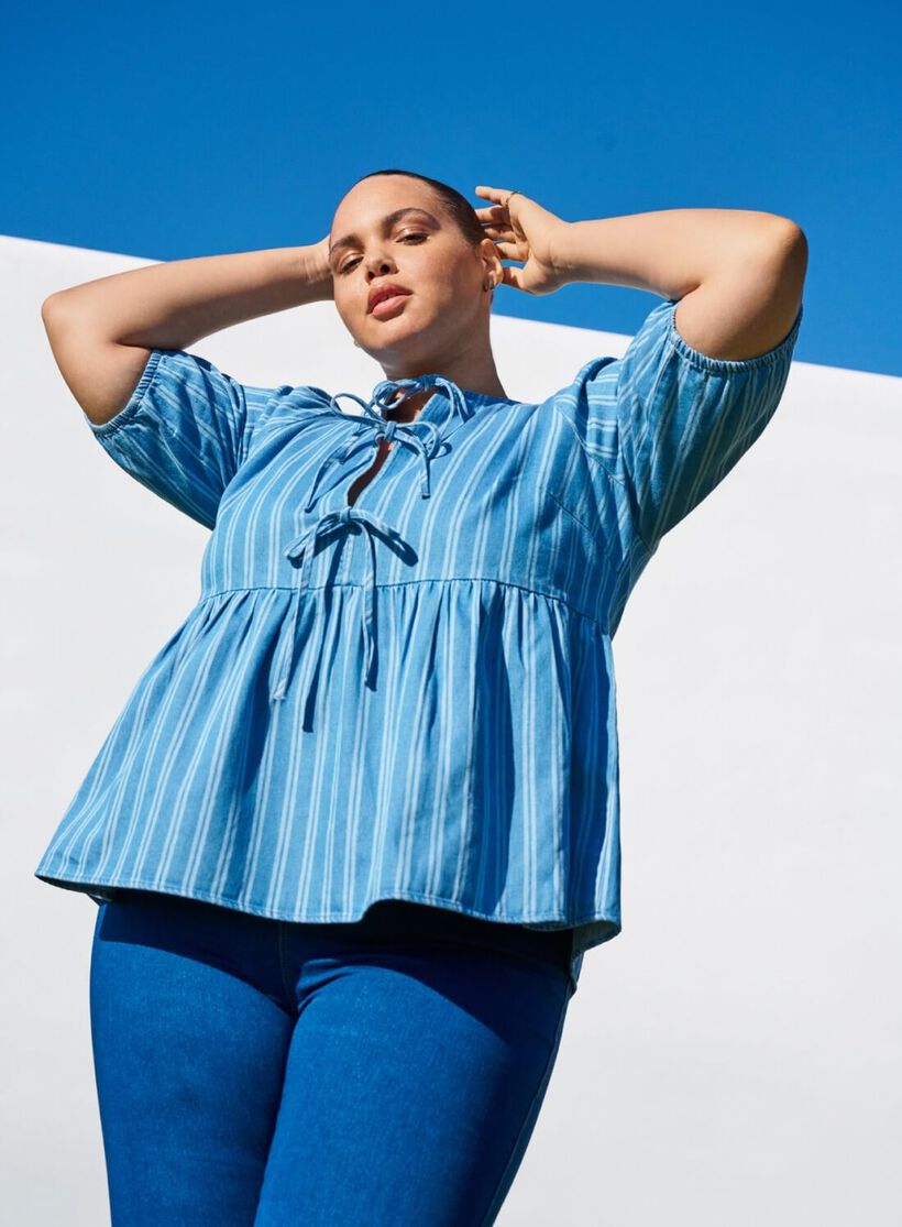 Chemisier en jean 100 % en coton avec motif rayé et manches courtes à volants avec des poignets élastiques. Le chemisier est conçu avec des cordons à nouer à l'avant et une couture à la taille, ce qui crée une silhouette féminine.