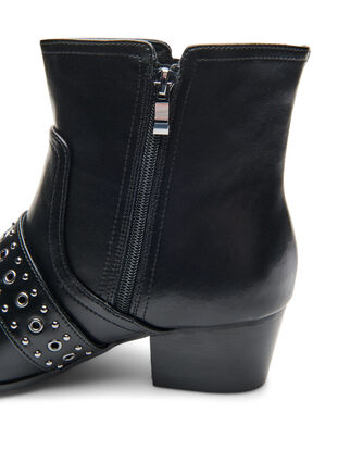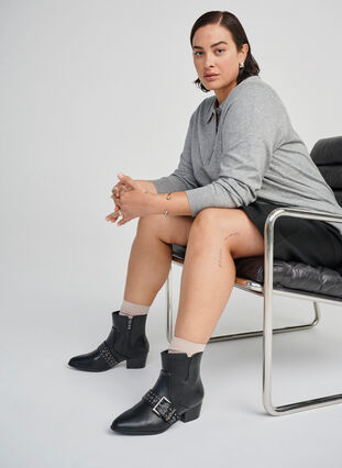 Bottines en cuir 100% véritable avec une coupe large et un large shaft, conçues pour les pieds plus larges. Les bottines ont un bout pointu, une bride décorative avec des clous et un talon bloc de 5 cm qui offre un confort optimal. Une fermeture éclair à l'intérieur et un insert élastique discret assurent une mise en place facile ainsi qu'un ajustement flexible autour de la cheville. Les bottines offrent de la place pour des semelles intérieures.