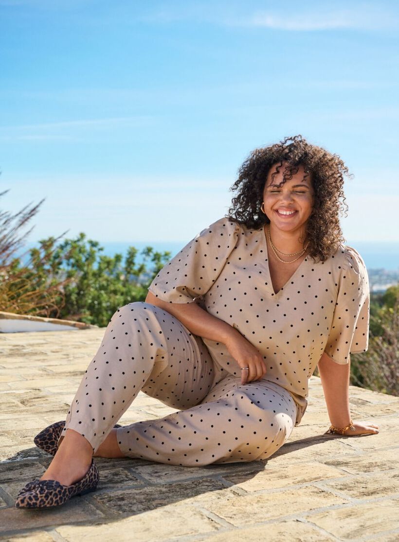 Pantalon en viscose douce, composé à 85 % de viscose LIVAECO™, orné d'un délicat motif à pois. Ce pantalon présente une taille haute avec ceinture élastique, des poches latérales et une coupe ample avec des jambes droites de la hanche à la cheville.