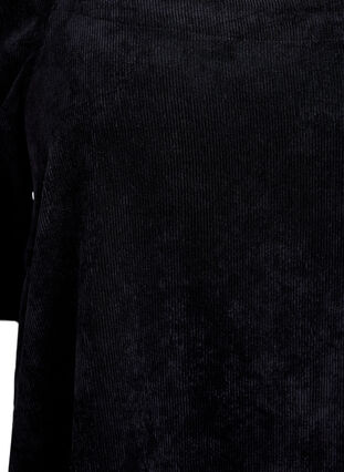 Robe courte en velours côtelé doux et confortable, avec des manches mi-longues et des poignets élastiqués créant un léger effet bouffant. Elle présente une encolure carrée avec un bord élastiqué et une coupe évasée ample pour un drapé féminin et délicat. Des volants décoratifs apportent une touche de mouvement supplémentaire à la robe.