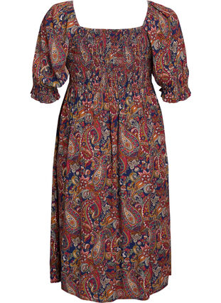 Robe féminine avec un imprimé floral fin, qui est faite dans une belle qualité de viscose. La robe a des manches mi-longues avec un bord smock, une encolure carrée et un smock au niveau de la poitrine, ce qui crée une silhouette féminine.