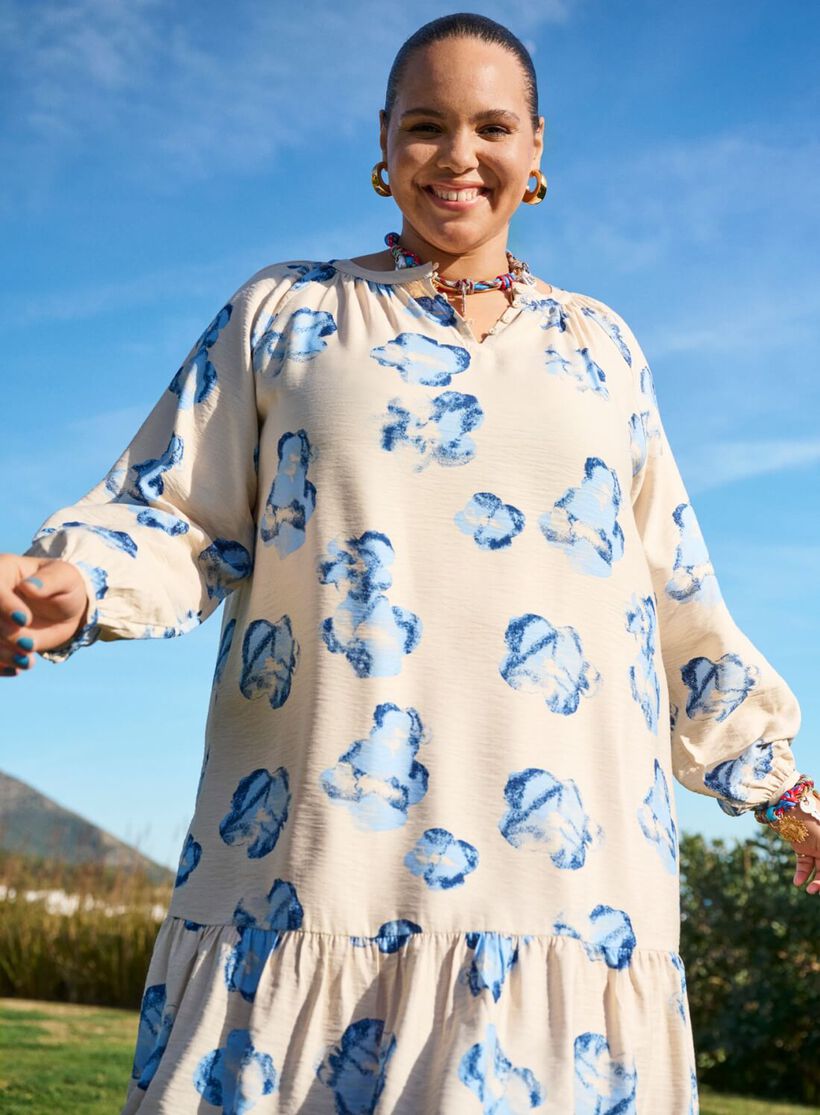 Robe arrivant au genou avec un magnifique imprimé all-over, une encolure ronde à petits boutons à l'avant et de longues manches raglan à manchettes étroites. La robe a une coupe en bas, ce qui crée un beau drapé avec une forme en A lâche. Cette robe est faite avec 92 % de fibres de viscose LENZING™ ECOVERO™, apportant douceur naturelle et drapé.