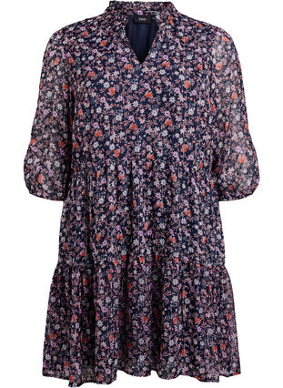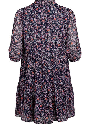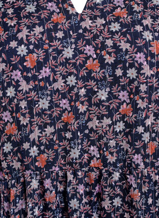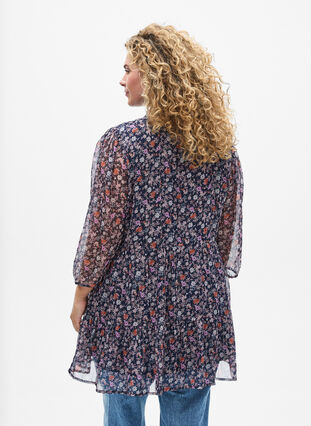 Tunique en tissu léger avec un imprimé floral féminin et de subtils fils scintillants. Elle présente une encolure arrondie avec un col à volants et une fente en V, ainsi qu'une doublure pour un confort optimal. La tunique est dotée de manches 3/4 légèrement transparentes avec poignets élastiqués et d'une coupe évasée. Ses coutures créent un drapé fluide et une allure féminine.