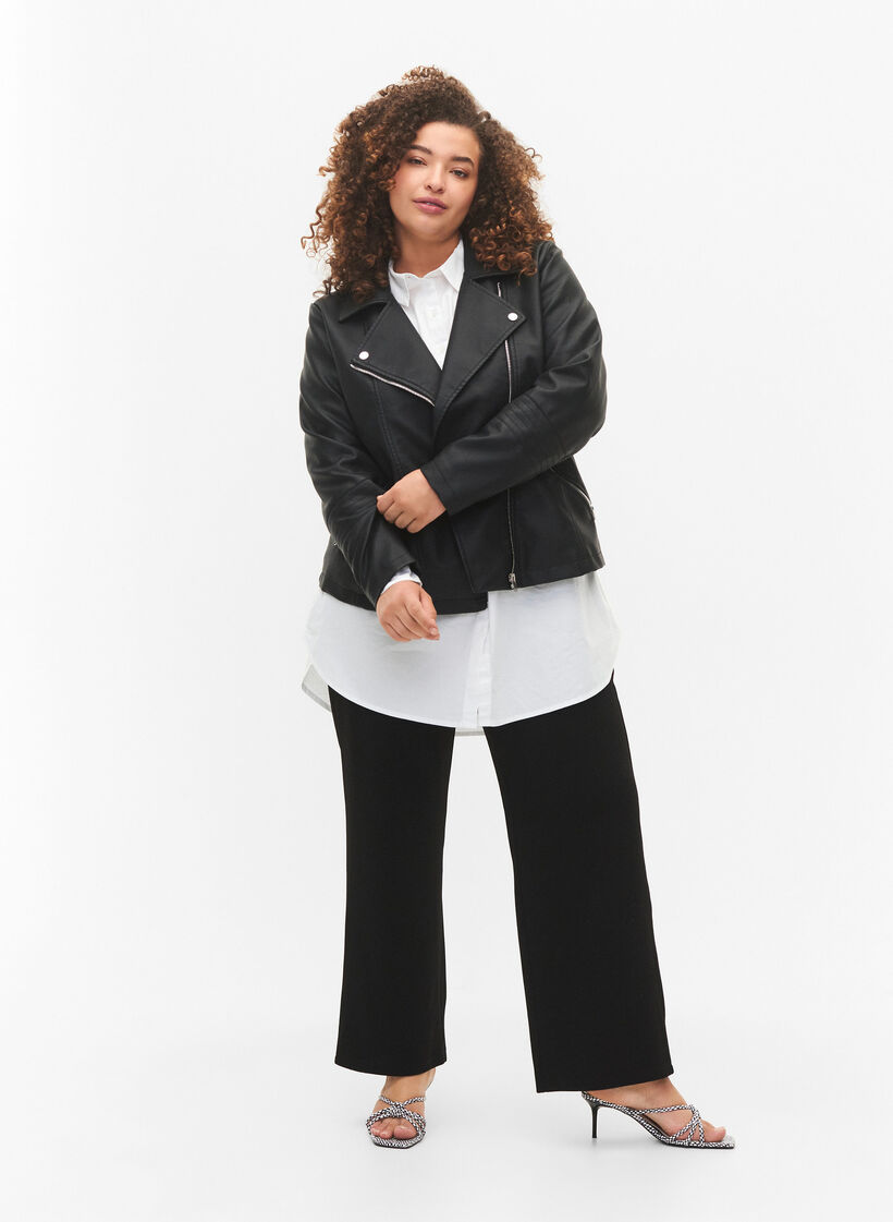Veste de moto décontractée en simili cuir et à fermeture éclair. Cette veste est ornée de motifs aux coutures, à l’encolure et aux revers. Elle a des poches latérales à fermeture éclair.