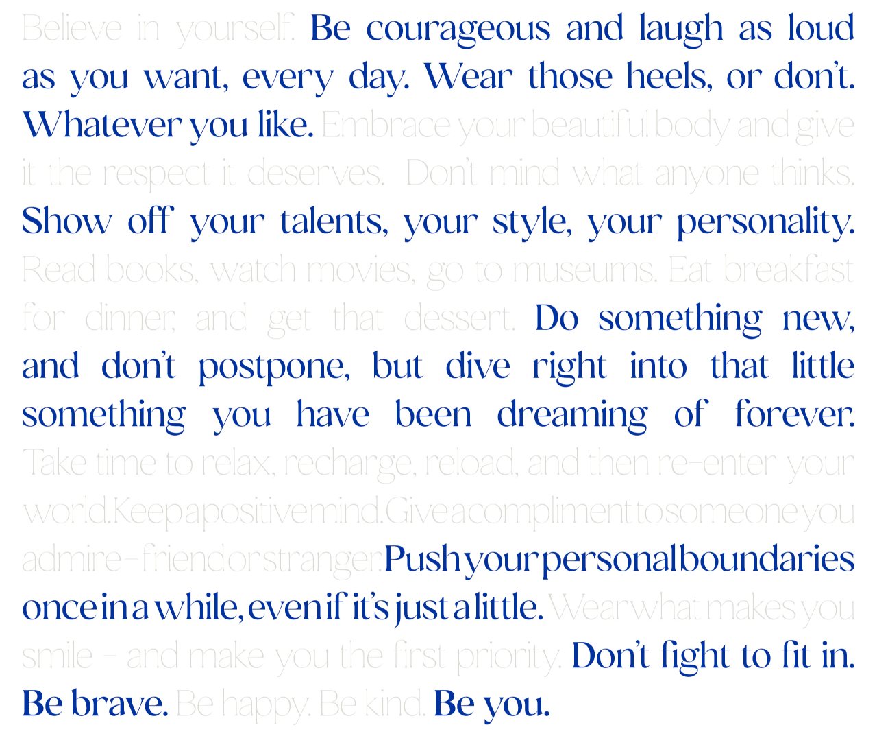 Pour nous, avoir du courage et être courageux peut signifier beaucoup de choses. Une couleur vive, une chemise échancrée, une paire de talons qui font tourner la tête. Sauter en parachute ou prendre le volant d'une voiture pour la toute première fois. Ou se tenir devant une caméra, se montrer sans filtre.