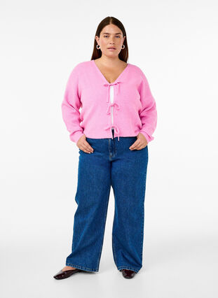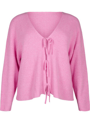 Un cardigan beau et confortable en tricot avec des liens à nouer et un col en V. Le cardigan est fabriqué à partir d'un tissu mélangé doux avec 94 % de polyester recyclé et a une coupe droite avec ouverture sur le devant.